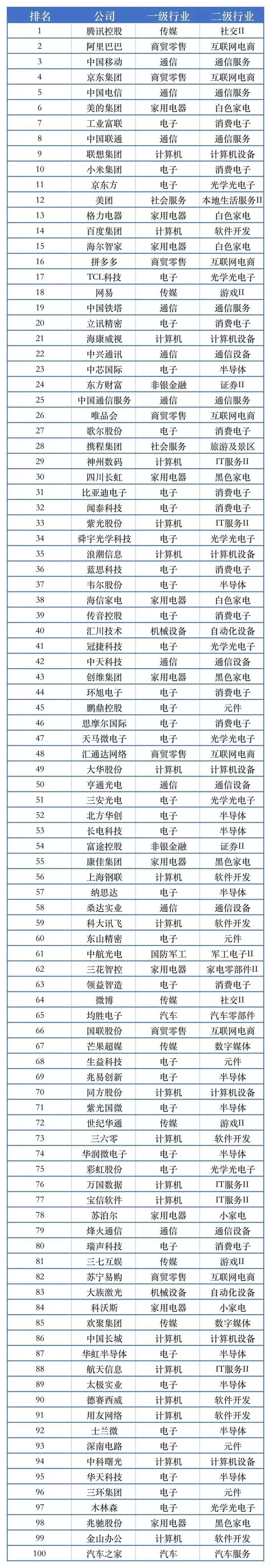 据了解,中国数字经济企业中综合实力表现突出的100家企业入选“2022中国数字经济100强”,排在前十位的依次是腾讯、阿里巴巴、中国移动、京东、中国电信、美的集团、工业富联、中国联通、联想集团和小米集团,覆盖了互联网、电信运营商和家电、电子制造企业。